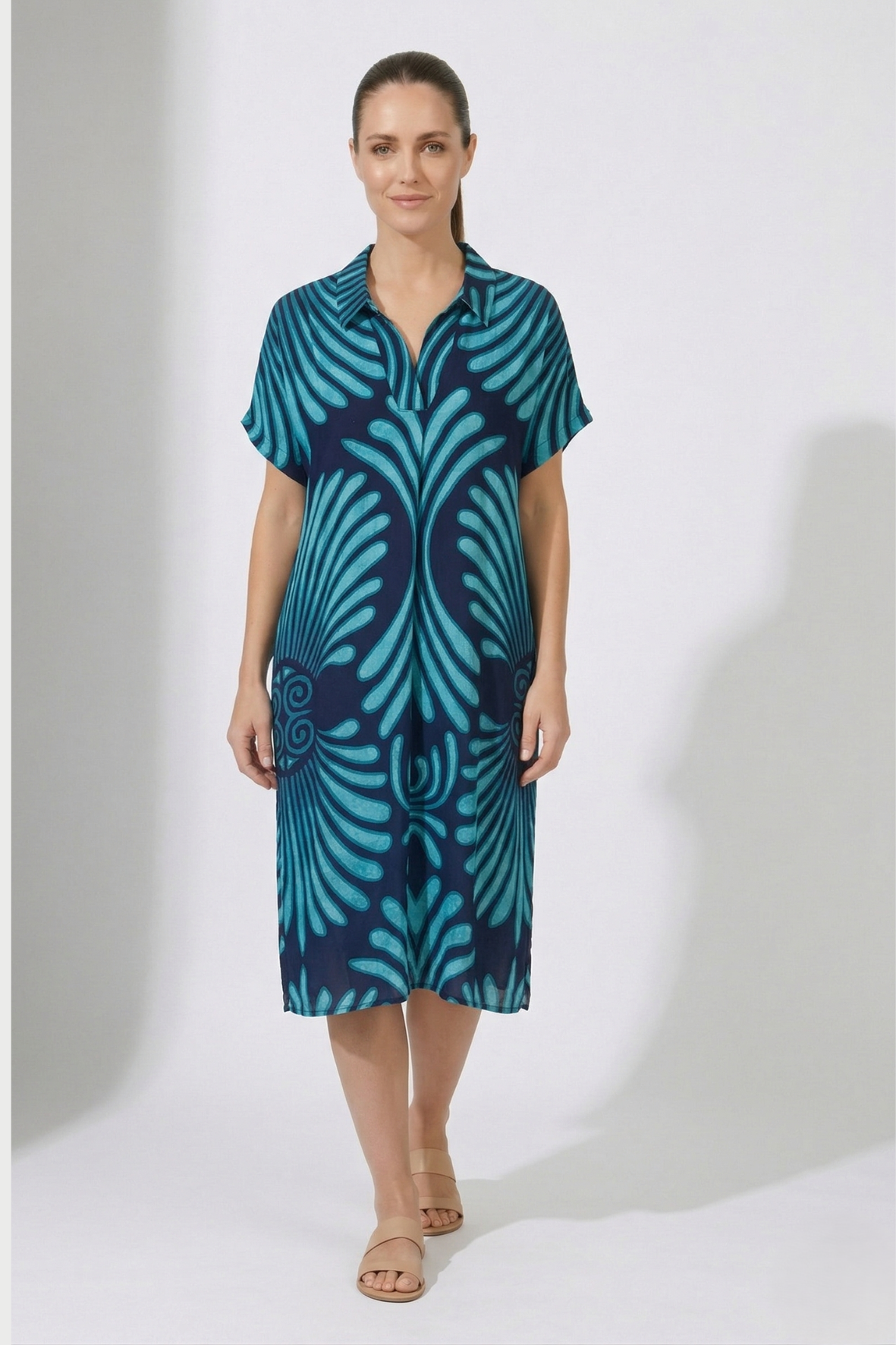 שמלת אוברסייז קיצית בהדפס רענן על רקע כחול נייבי .