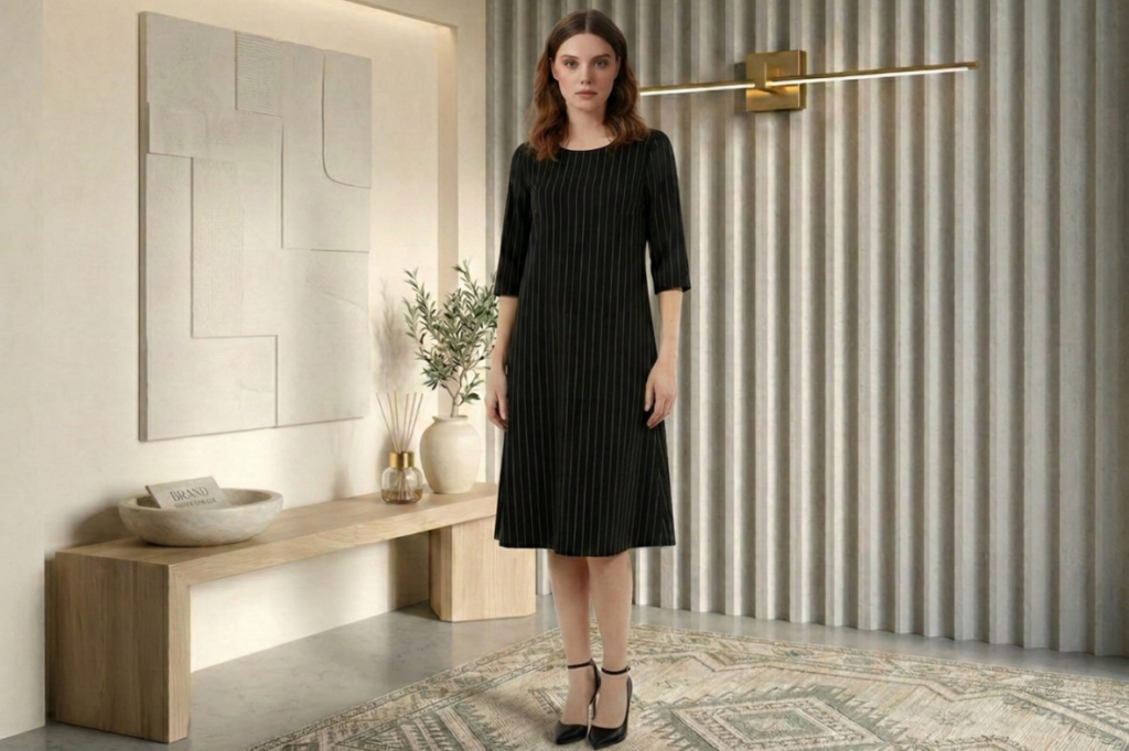 שמלה מעט מתחת לברך יוצרת מראה קלאסי ואלגנטי.