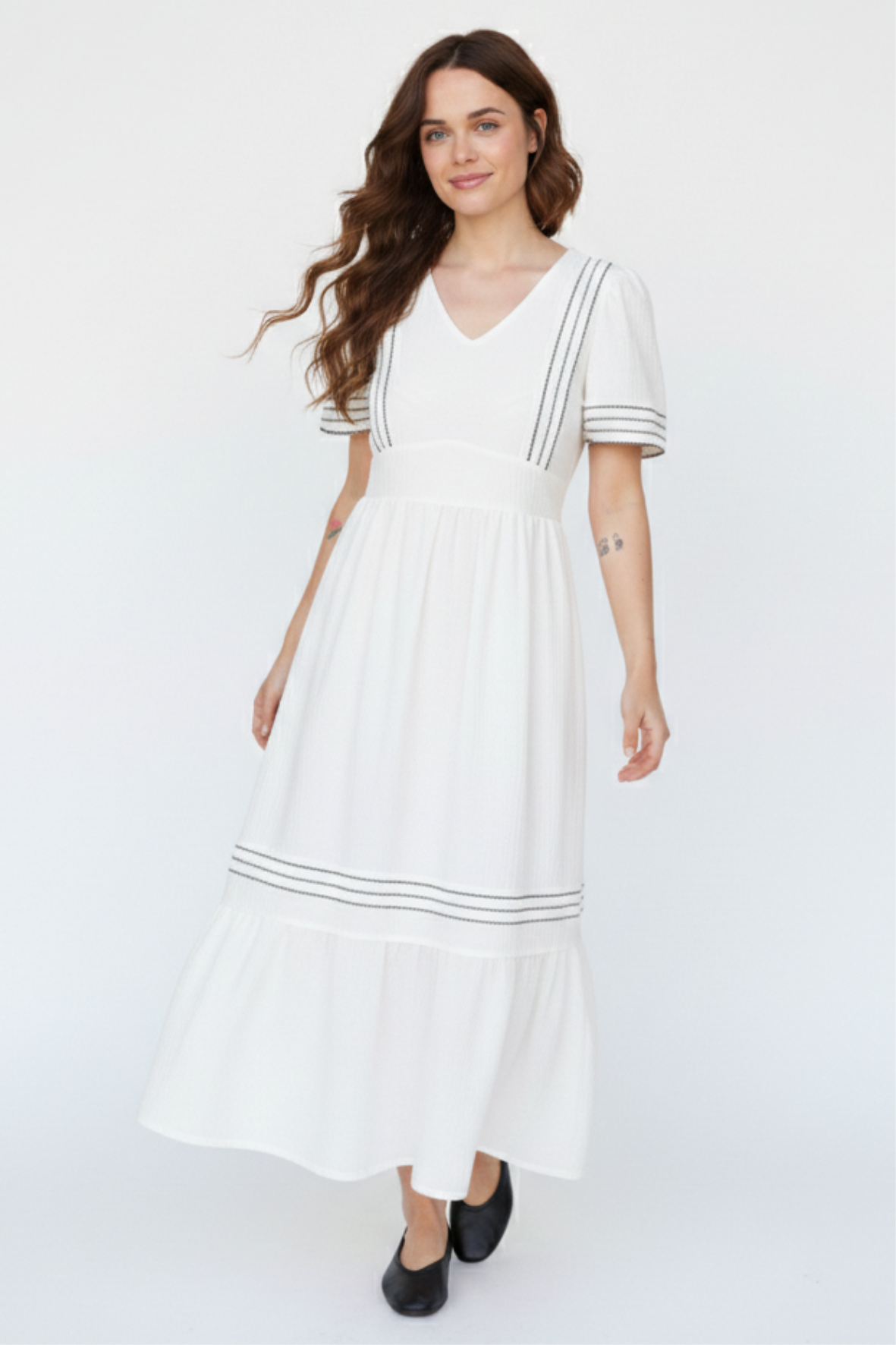 Stylish and Elegant midi dress with beautiful V-shaped neckline , 3/4 sleeves .